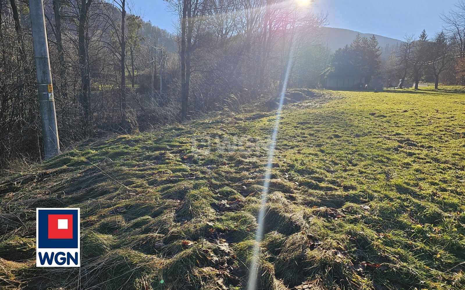Działka częściowo pusta, częściowo porośnięta drzewami, przy granicy działki płynie strumyk.