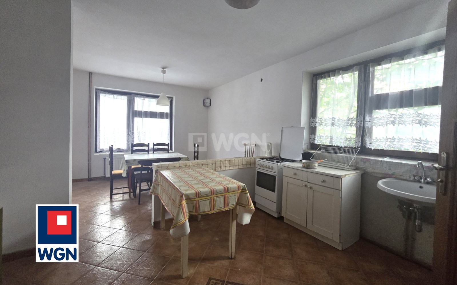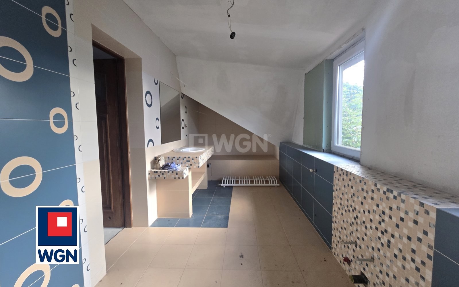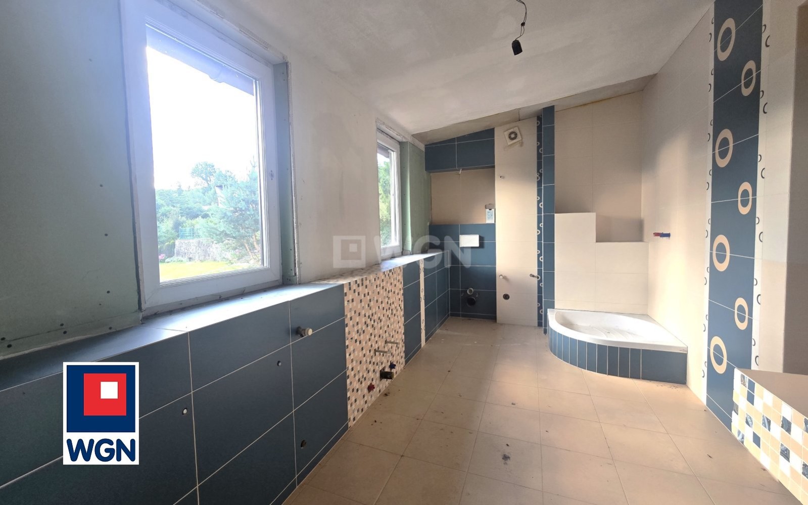 Dwie łazienki wykończone, pralnia, spiżarka, kuchnia, jadalnia, korytarz w płytkach, okna drewniana, kilka plastikowych.
