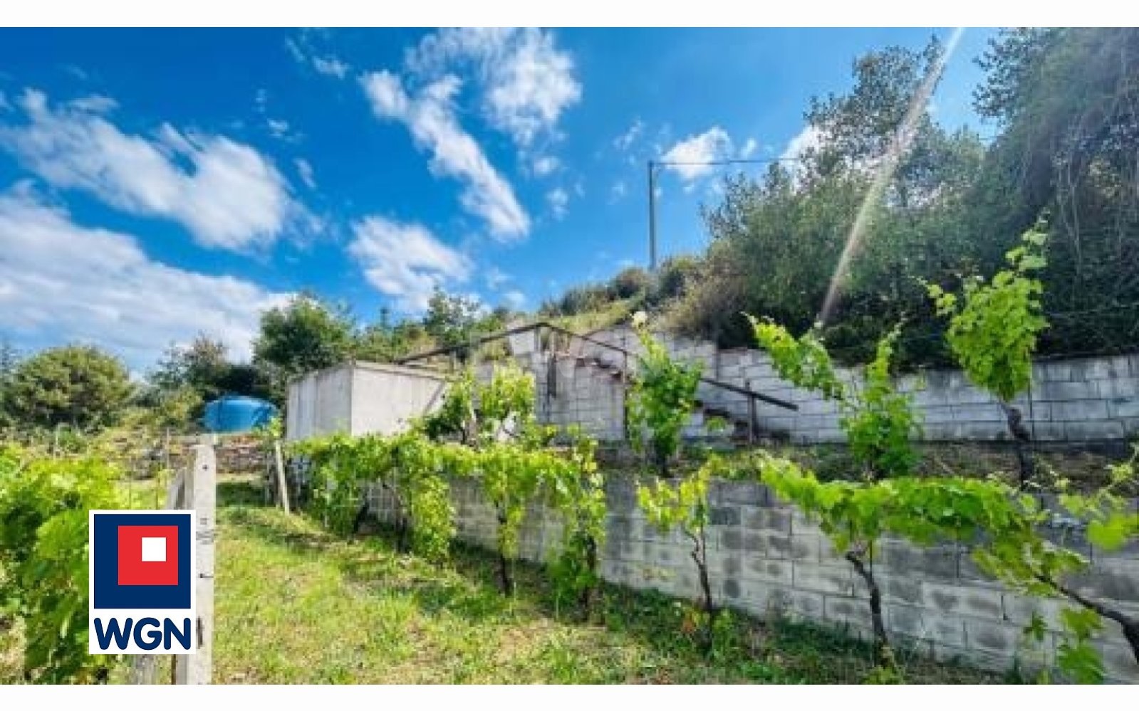 Domek na narzędzia i zbiornik na wodę na terenie działki.