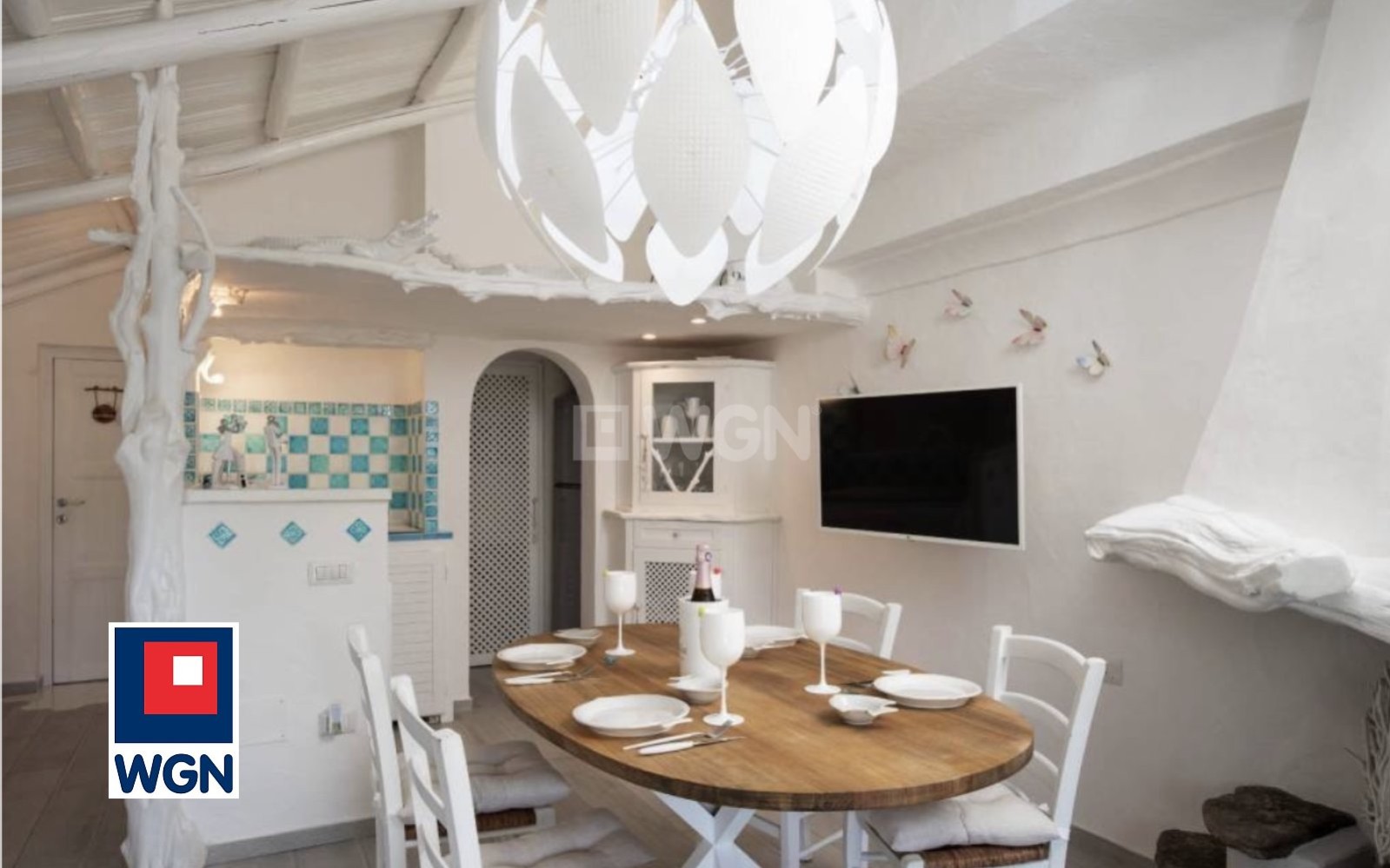 - Jasna i przyjemna część dzienna prowadzi na piękną, zadaszoną werandę wyjątkową przestrzeń z prywatną mini-wanną z hydromasażem w stylu ?Santorini.