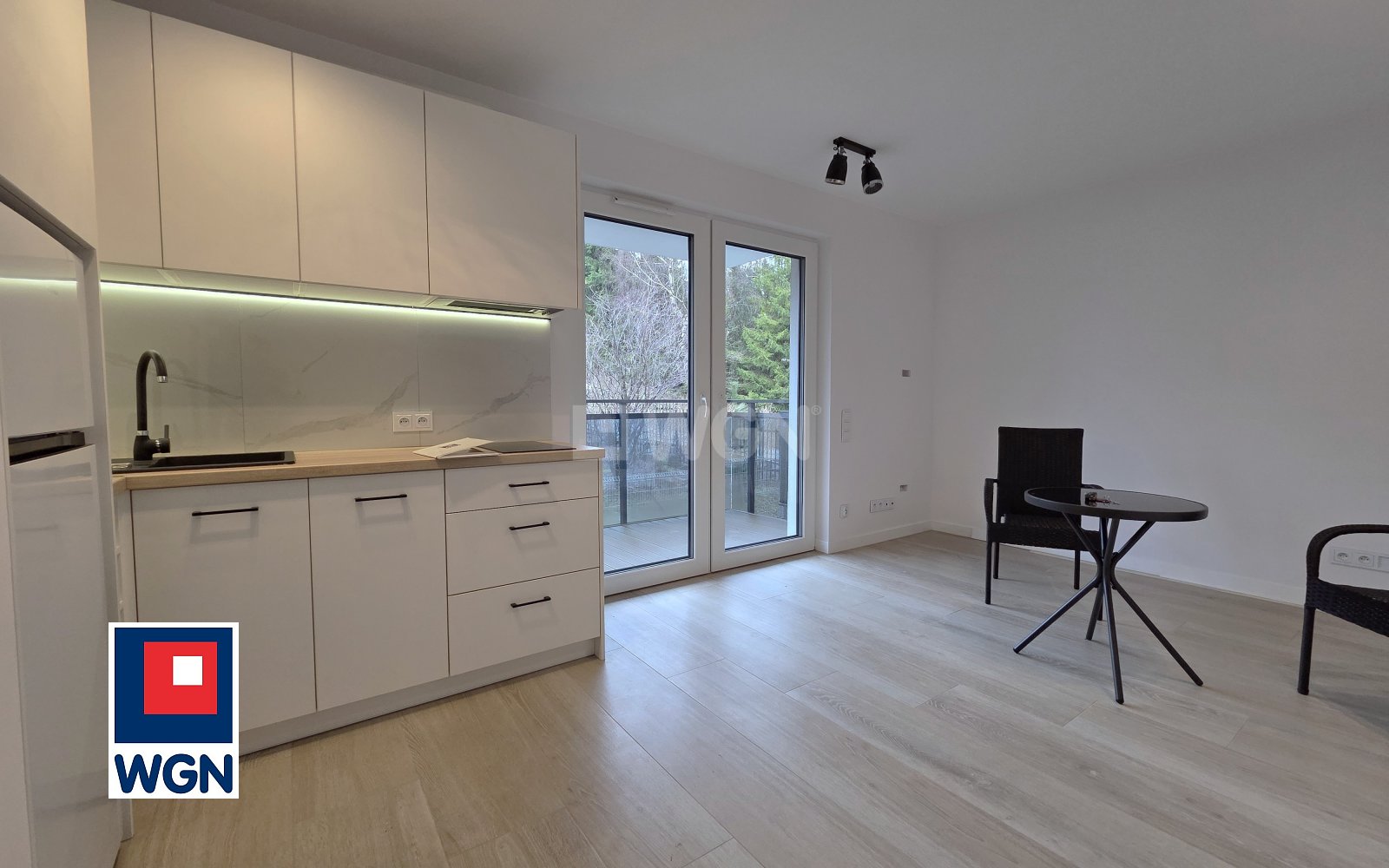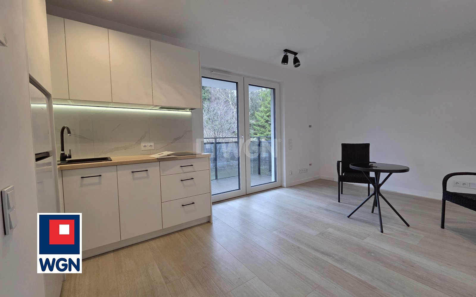 Salon z aneksem kuchennym z wyjściem na przestronny balkon.