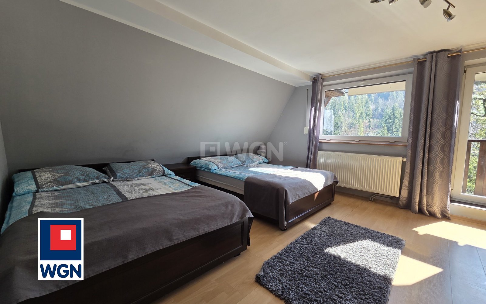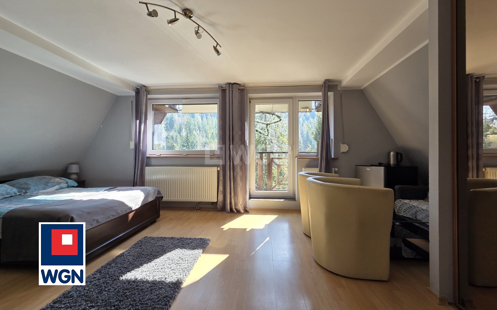 -duża sypialnia z wyjściem na duży balkon i z garderobą